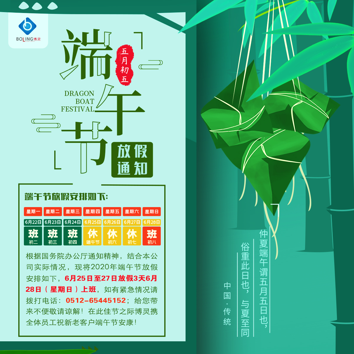 2020端午節即將來臨,根據國家法定節假日安排及我公司之實際情況,經公司領導研究決定我公司端午節放假三天,具體安排如下: